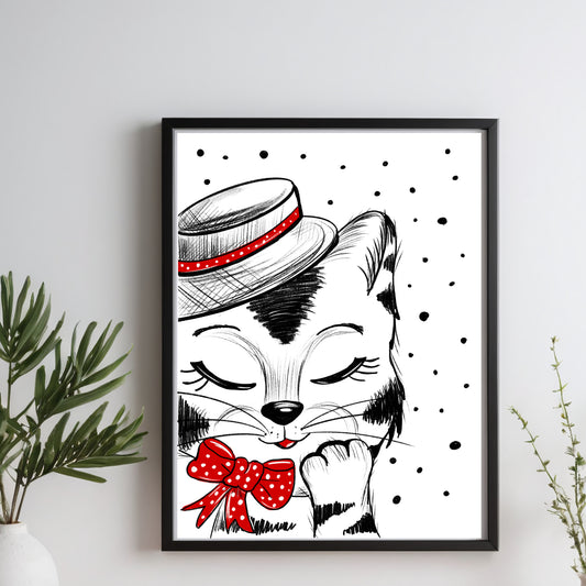 Poster Katze in Hut , Geschenk Katze Kunst Schwarz-Weiß Wand Dekor Poster, Druck Digital Download