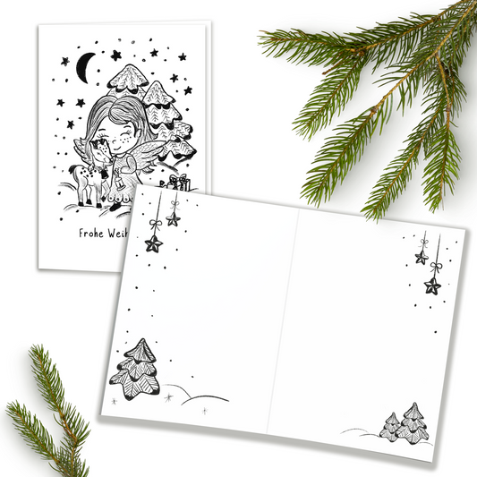Weihnachtskarte "Mädchen mit Rentier"- auch zum Ausmalen